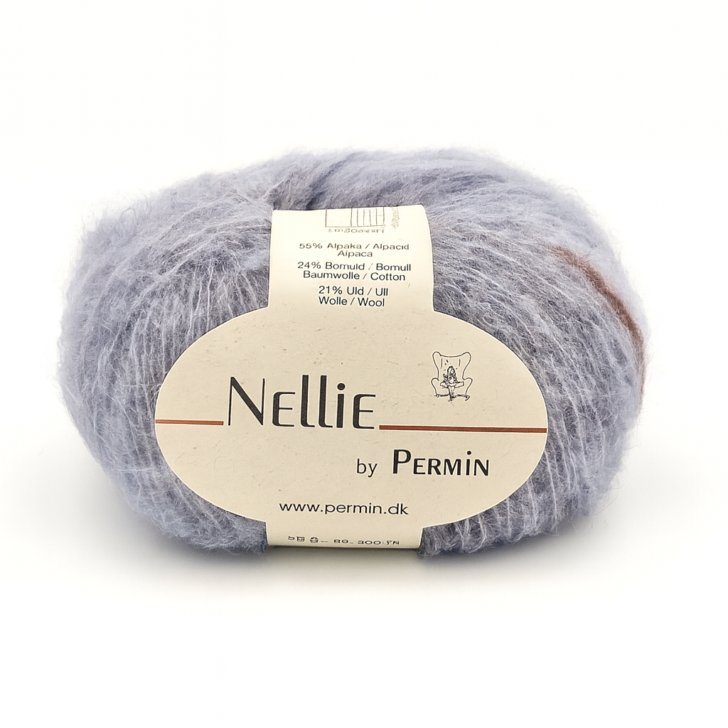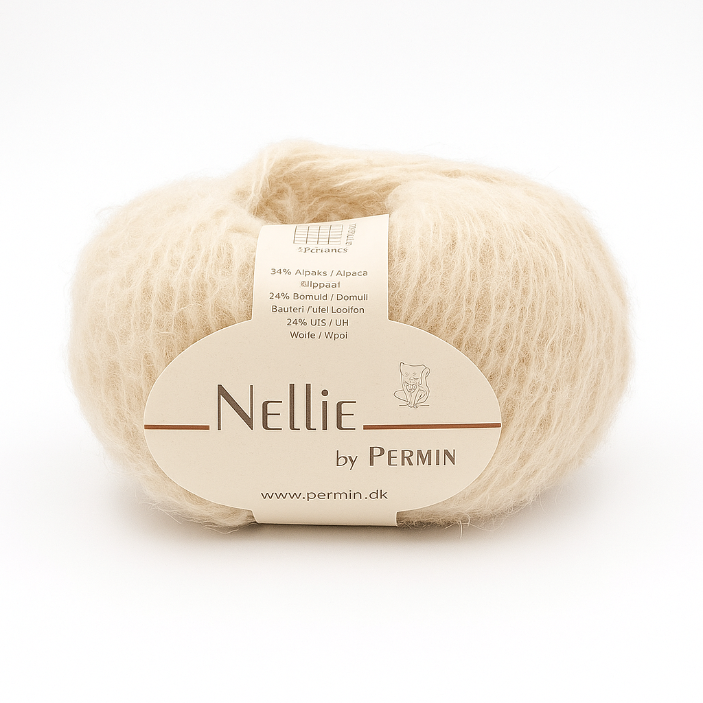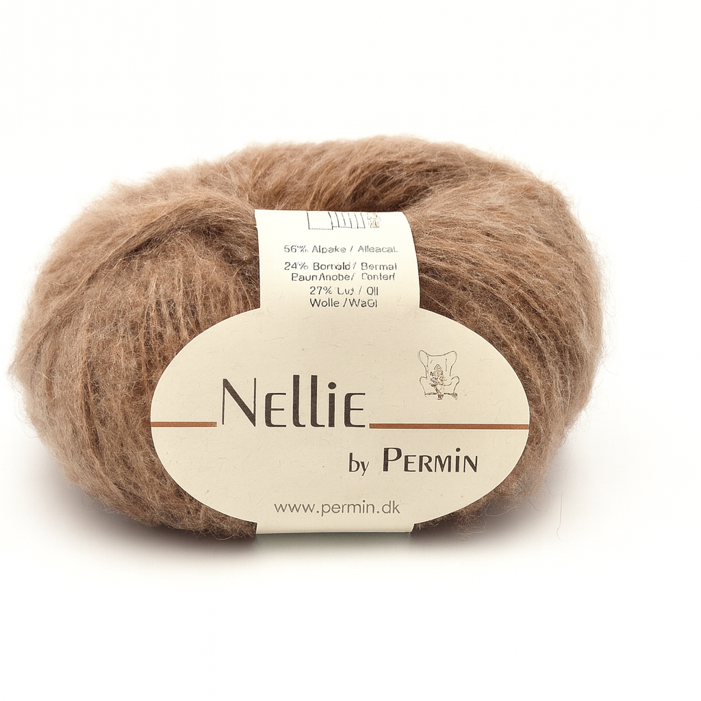 Nellie fra Permin er et let og luftigt garn spundet af alpaka, bomuld og uld. Sammensætningen giver en blød, vamset tråd med et elegant og levende udtryk, der gør dit strik lunt uden at blive tungt.